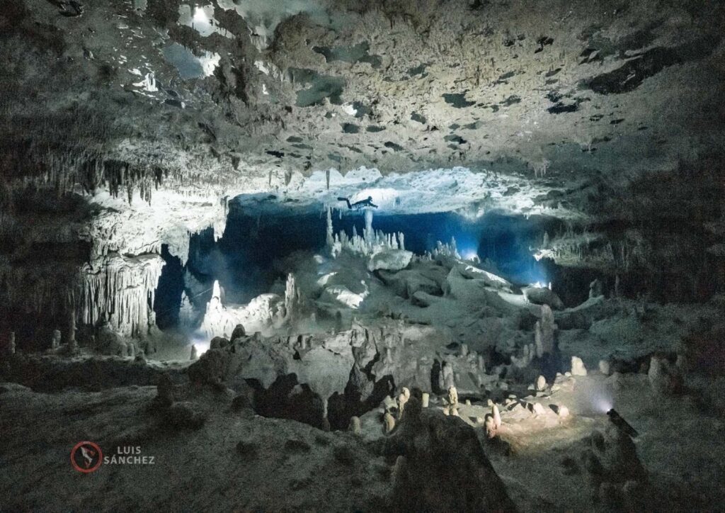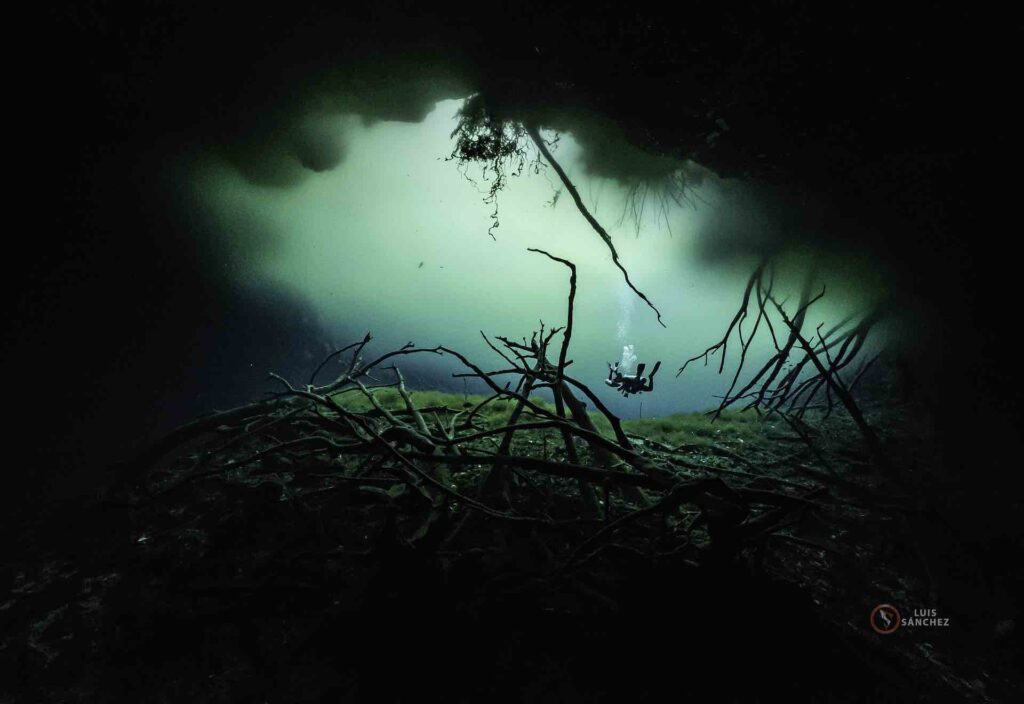 Dives inside ancient underground river systems where freshwater flows through sculpted limestone formations.